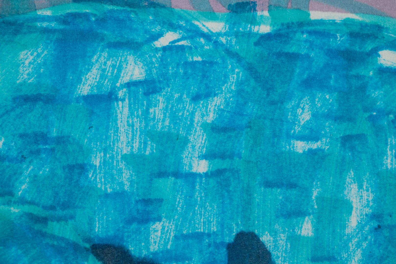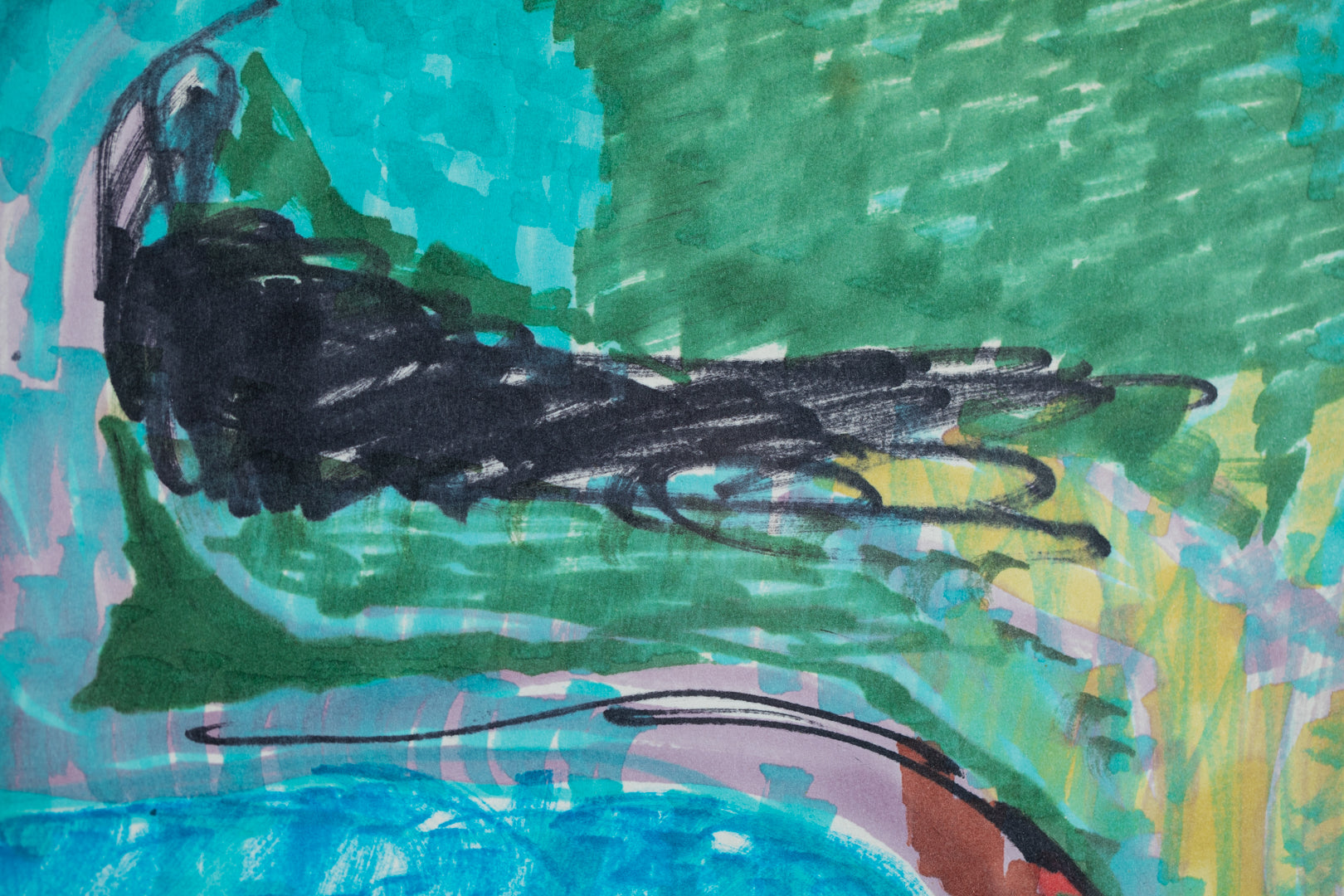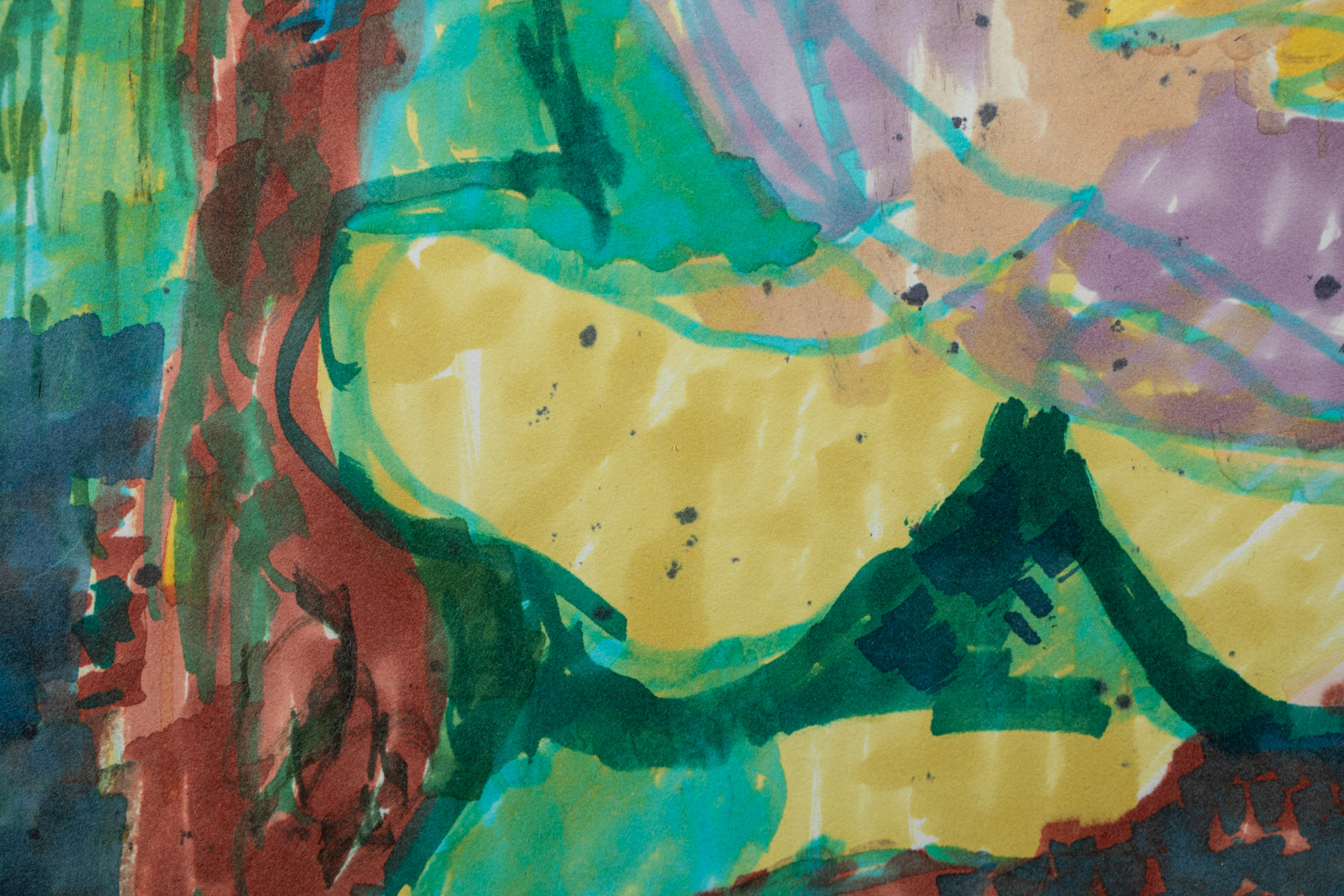本作は、髙山の作品としては珍しくフェルトペンで描かれている。多彩な色彩と面の構成が目を引くが、そこには母親が子を抱く姿が浮かび上がる。母親は目を閉じ、口元には柔らかな微笑みが漂い、子供はその思いを知らぬままにまっすぐな眼差しを向けている。