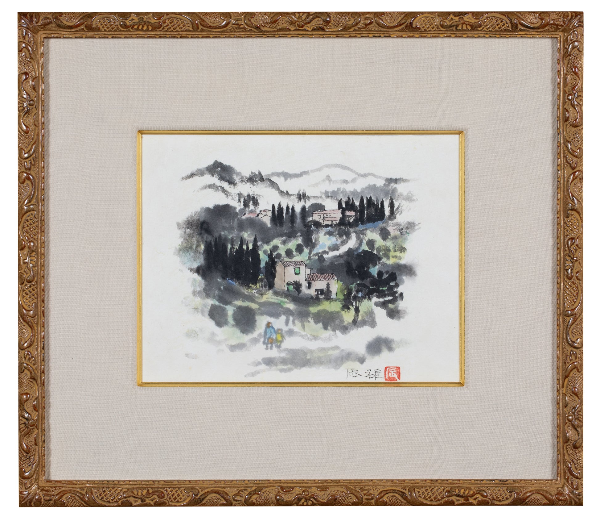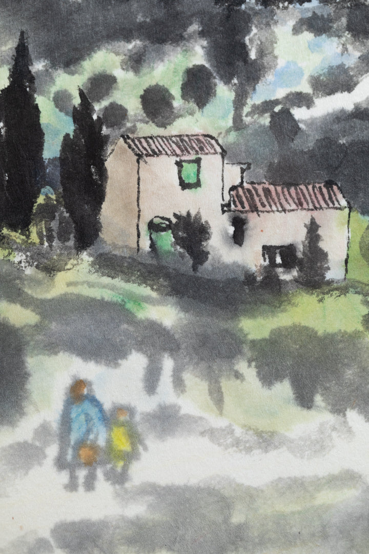 本作は水彩と墨を用いて描かれた作品である。山間に佇む集落の家並や杉木立は中央部で濃く力強く描かれ、周囲に広がるにつれて墨が柔らかくぼかされ、奥行きと余韻を生んでいる。画面手前には鞄を持つ親子と見られる二人が描かれ、その姿は村を離れようとしつつも、どこか振り返っているように見える。