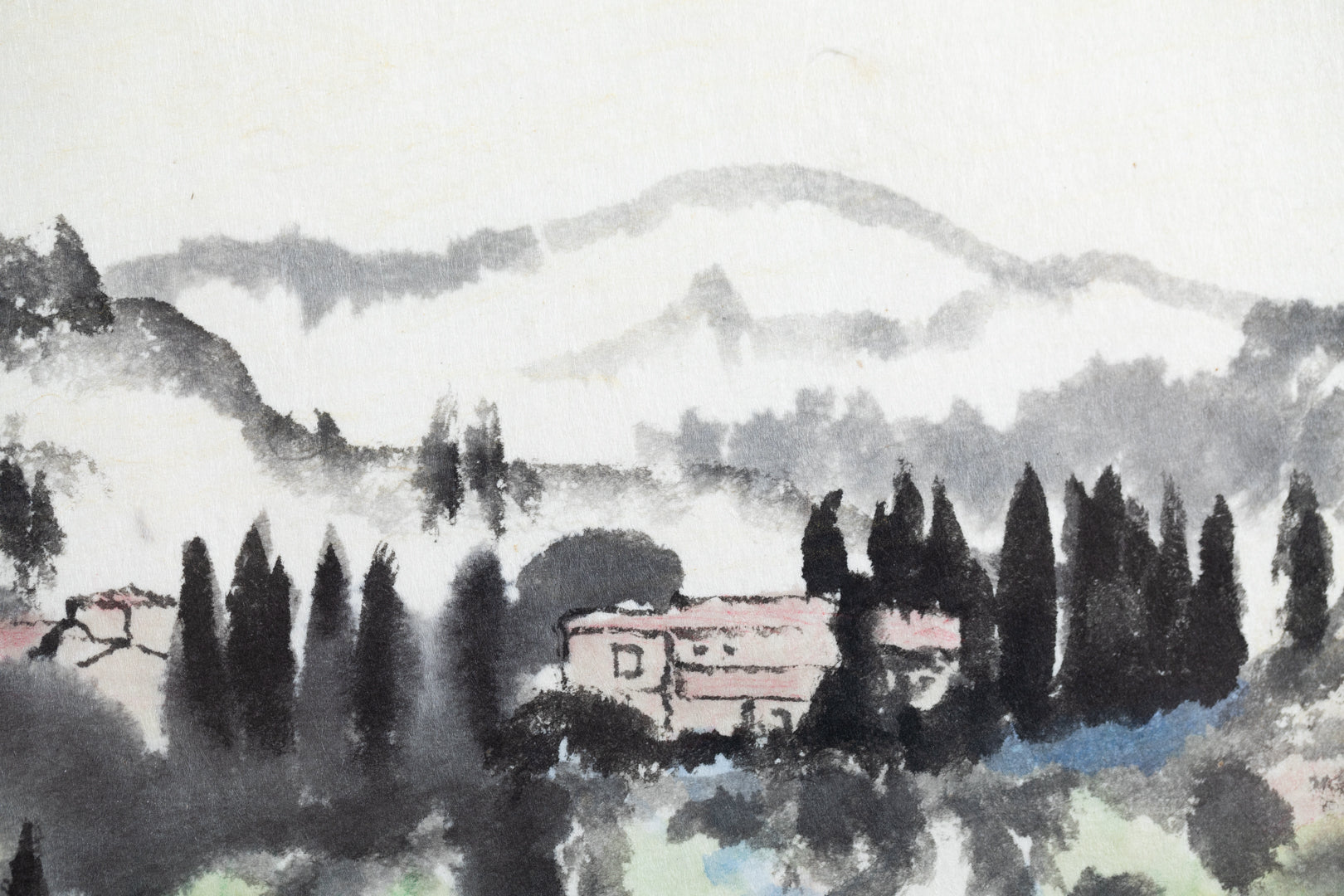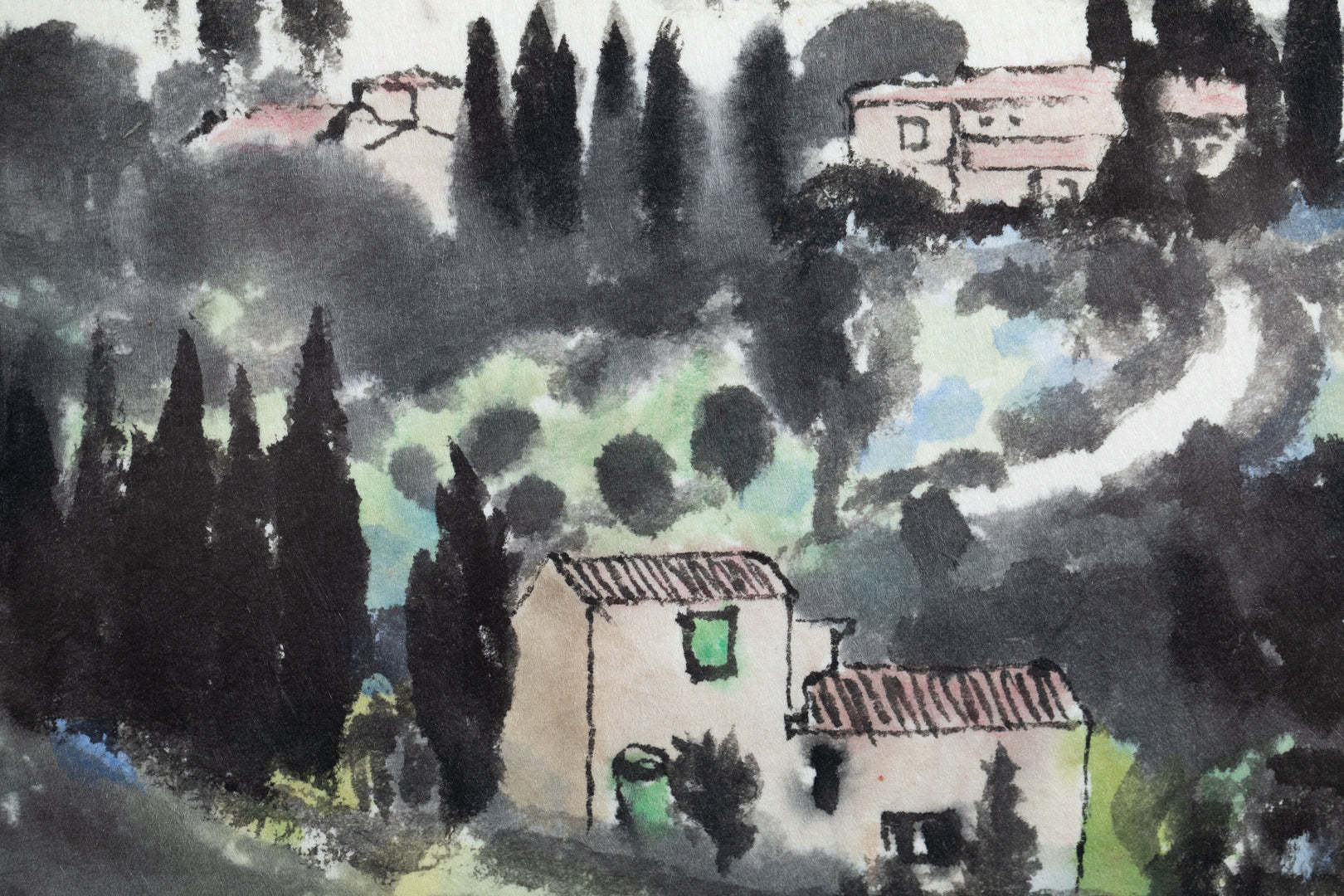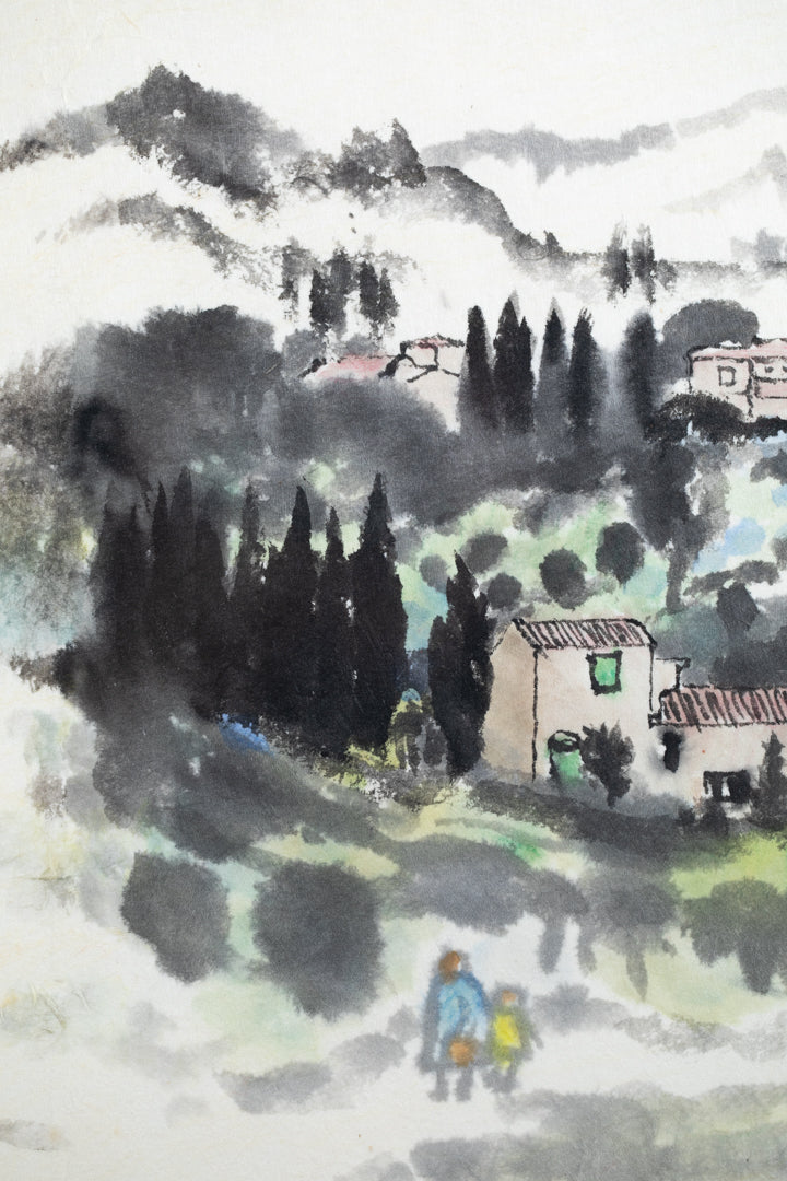 This work, executed in watercolor and ink, portrays a mountain village with striking contrasts. At the center, the clustered houses and tall cedars are delineated in firm, dark tones, while the surrounding landscape is softened with washes that blur into atmosphere, creating a sense of depth and lingering quiet.